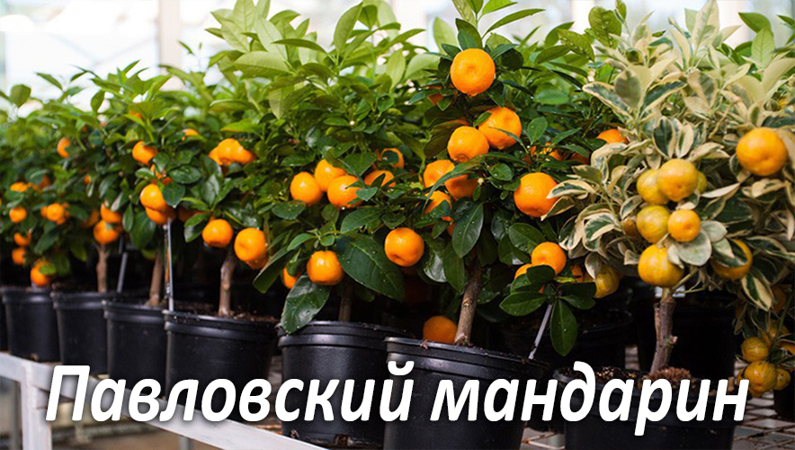Павловский мандарин (померанец) — это неприхотливое растение высотой до 70 см с раскидистой кроной, которое цветет и плодоносит круглый год. У него тонкая, ярко-оранжевая кожица и кисло-сладкая сочная мякоть.