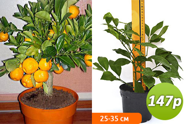 Карликовое дерево высотой до 60 см. Крона шарообразная, сильноразветвленная. На ветвях тонкие, длинные колючки. Листья темно-зеленые. Бутоны фиолетового цвета, раскрывающиеся в небольшие белые ароматные цветы. Цветет очень обильно. Плоды небольшие (от 30 до 80 граммов), округлые, оранжевые, с тонкой кожурой, бессемяные. Мякоть сочная, ярко-оранжевого цвета, ароматная, пресно-сладкая с небольшой горчинкой. Стоимость за 1 деревце 147 руб.